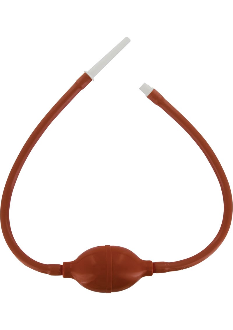 This one is a Higginson syringe one-way pump. This bulb and nozzle combo sends liquid from one end submerged in liquid to the other end fitted with a tapered nozzle. The nozzle may be inserted into the rectum or into another device, such as CleanStream Inflatable Butt Plug, Double Bulb Bardex-Style, or a Bag Drip System. Inserting the In-Line Accelerator into another device gives extra control to pump liquid in a steady stream.