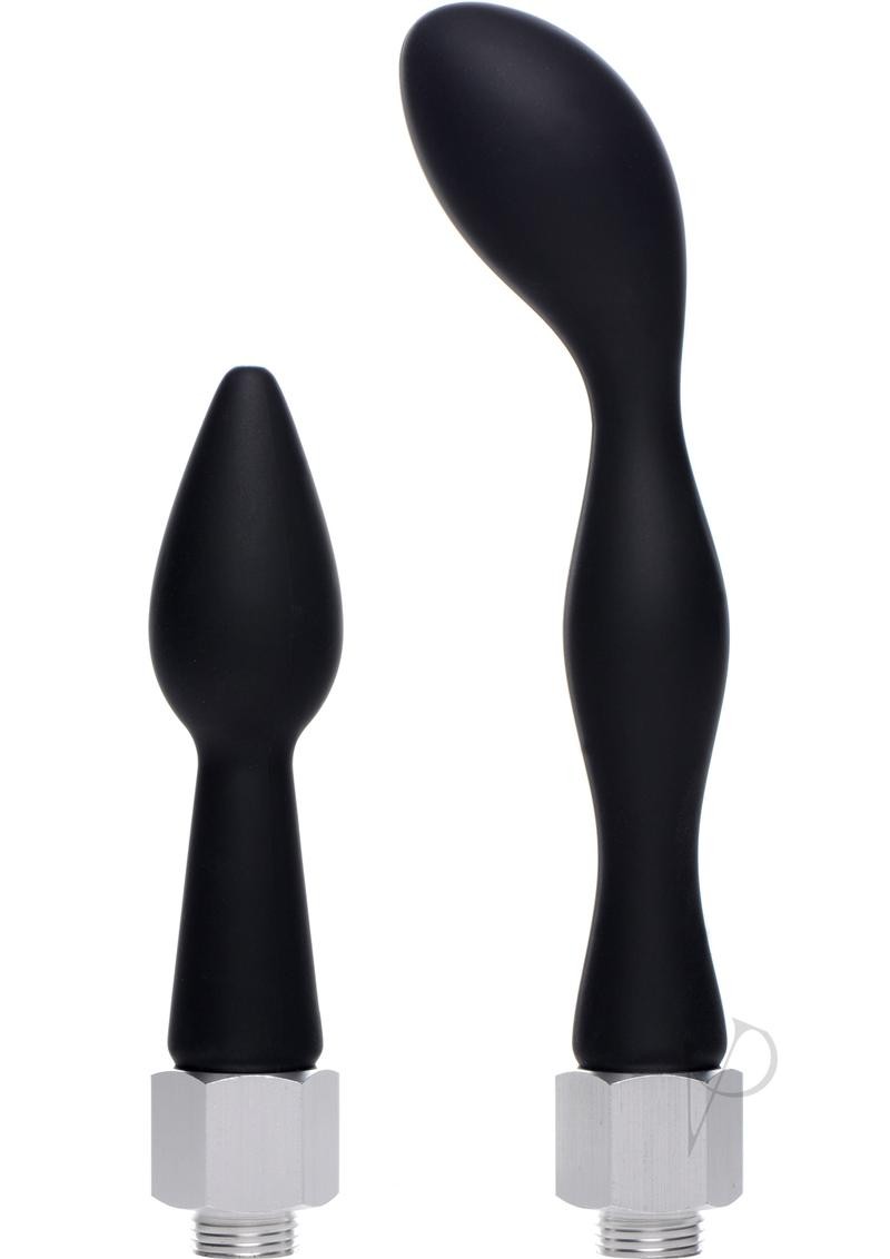 Molded of premium silicone, the lengths and shapes of these nozzle attachments offer a unique cleaning experience. Both tips include the screw-on base to attach to the hose of your enema system. The smaller nozzle is tapered to slide easily into you until the bulb is fully inserted for a comfortable penetration. The large nozzle has a curved head to provide targeted pleasure during use, with a longer shaft for deep cleaning. Both attachments are smooth, durable, and easy to grasp in the shower. Not compatible with silicone lubricant.
