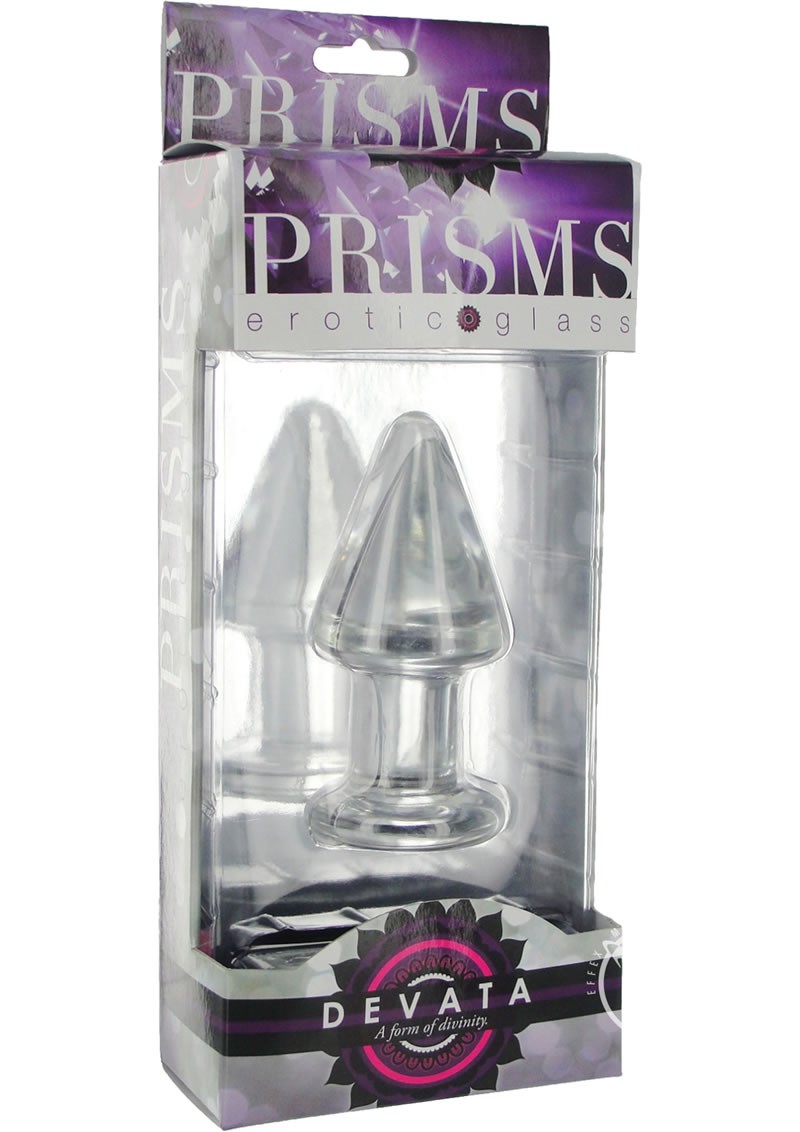 The Devata plug makes an exquisite addition to your glass toy collection. Uniquely handcrafted, this glass creation resembles an exclusive piece of art. The Devata begins as a gently rounded point, widening outwards before tapering at the neck. A flared circular base is flat-bottomed, allowing the toy to stand up on its own for solo play. The Devata is perfectly sized for beginners and intermediate anal aficionados alike! Made entirely of Borosilicate glass, the Devata is non-porous and easily maintained with soap and water. Want to spice things up even more? Devata can be served warmed or chilled.