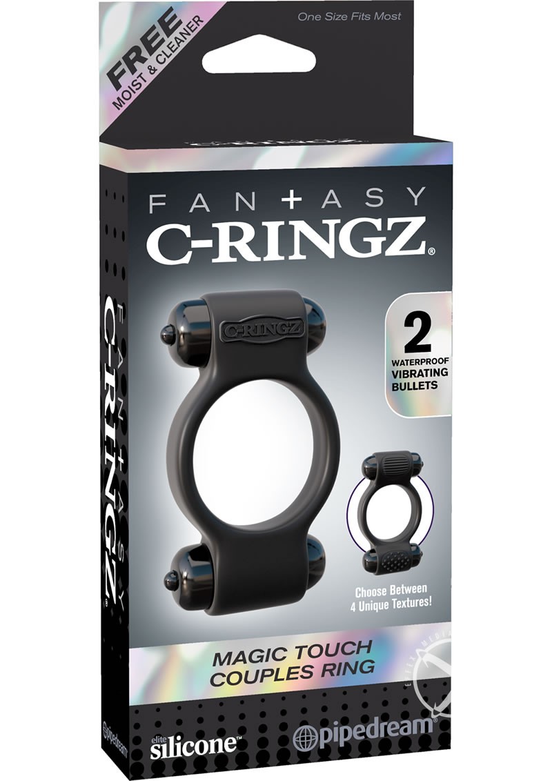 Get just the right touch of satisfaction with the incredible Magic Touch Couples Ring! Made from body-safe, phthalate-free Elite Silicone, this dual-action vibrating ring easily stretches for maximum comfort and proven results. What really makes this ring magical is the four unique textures on each side of the vibrating bullets. Face the ring towards your body for a thrilling ball buzz, or flip the ring around and your partner will enjoy the vibrating sensations.
