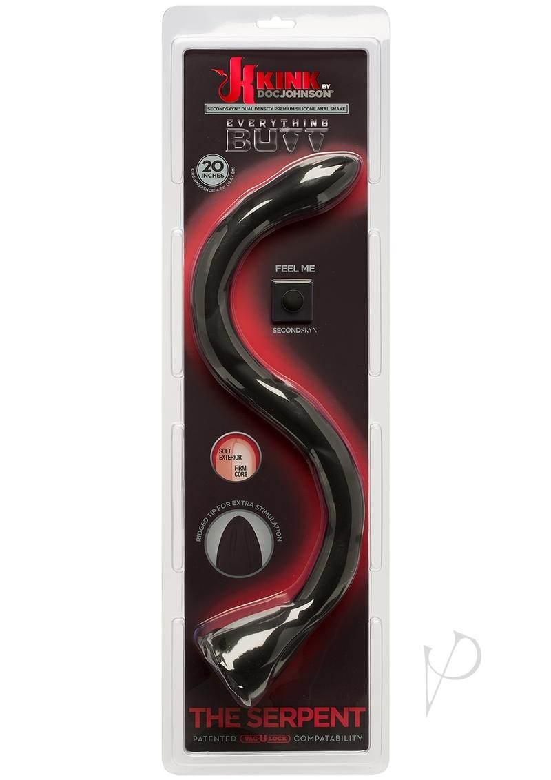 The Serpent from the Kink by Doc Johnson collection is crafted to please in dual density SecondSkyn silicone, an enticingly soft, flexible silicone that yields to your touch and molds to fill your every need. Its narrow width is perfect for teasing or a fast push, while the extended length and thick bulbed tip are ideal for goal-setting and deep exploration for players who have conquered our In Deep Anal Snake. The soft, silky surface makes it easy to feed every inch into the receiving ass. Kink by Doc Johnson is an exciting collaboration with Kink.com to create a collection of high-quality authentic fetish items suitable for long-term practitioners and new initiates alike.