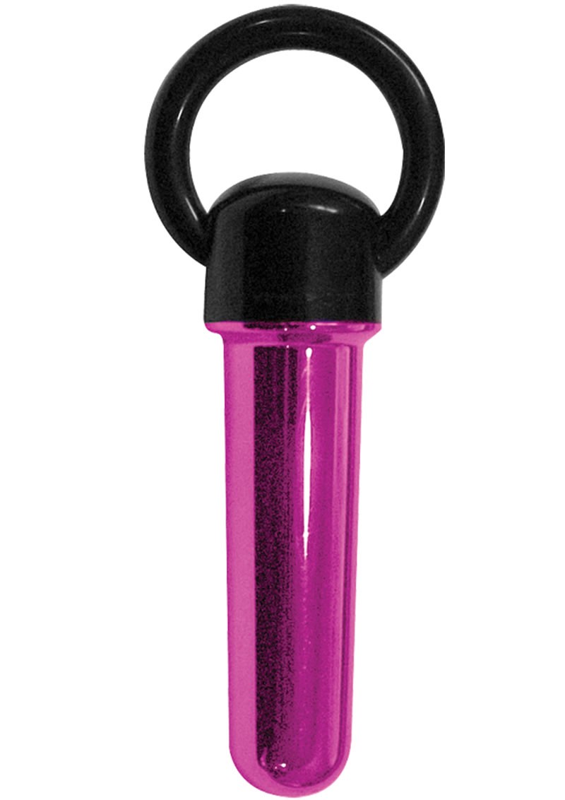 Metallic colored chrome two inch mini vibrator bullet comes with battery and can be attached to a keychain or worn as a pendant. Handy finger loop at end for no slip grip. Pretty and non sexual in appearance. Waterproof. 1.5V battery included.