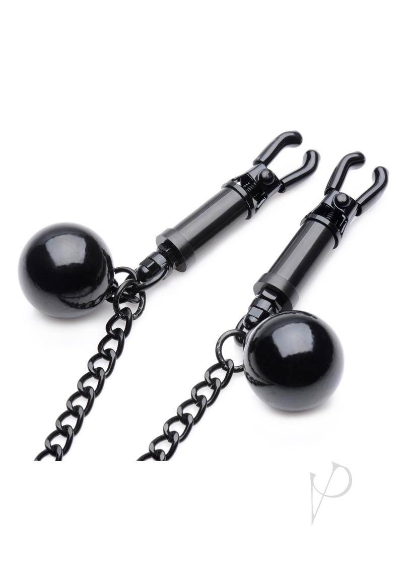 These sadistic clamps offer the framework for a wide array of pleasure play. Featuring 4 ounce dangling weights and a tuggable chain, these clamps are perfect for creating the nipple sensation play you crave. The clamps are highly adjustable via the twisting barrels. No forgiving spring loaded clamps here! Just screw down tight for unrelenting pressure. Rubber-coated tips ensure a good grip and add comfort.