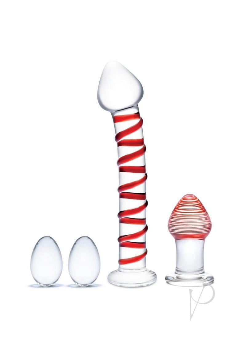 Mix and match items from this 4-piece set for an orgasmic experience during a solo session or partnered play unlike any other. This set can be used to strengthen Kegels with the glass yoni eggs or enjoy backdoor stim from the beginners-friendly butt plug. For deep G-spot stimulation, Mr. Swirly offers an intense massage.