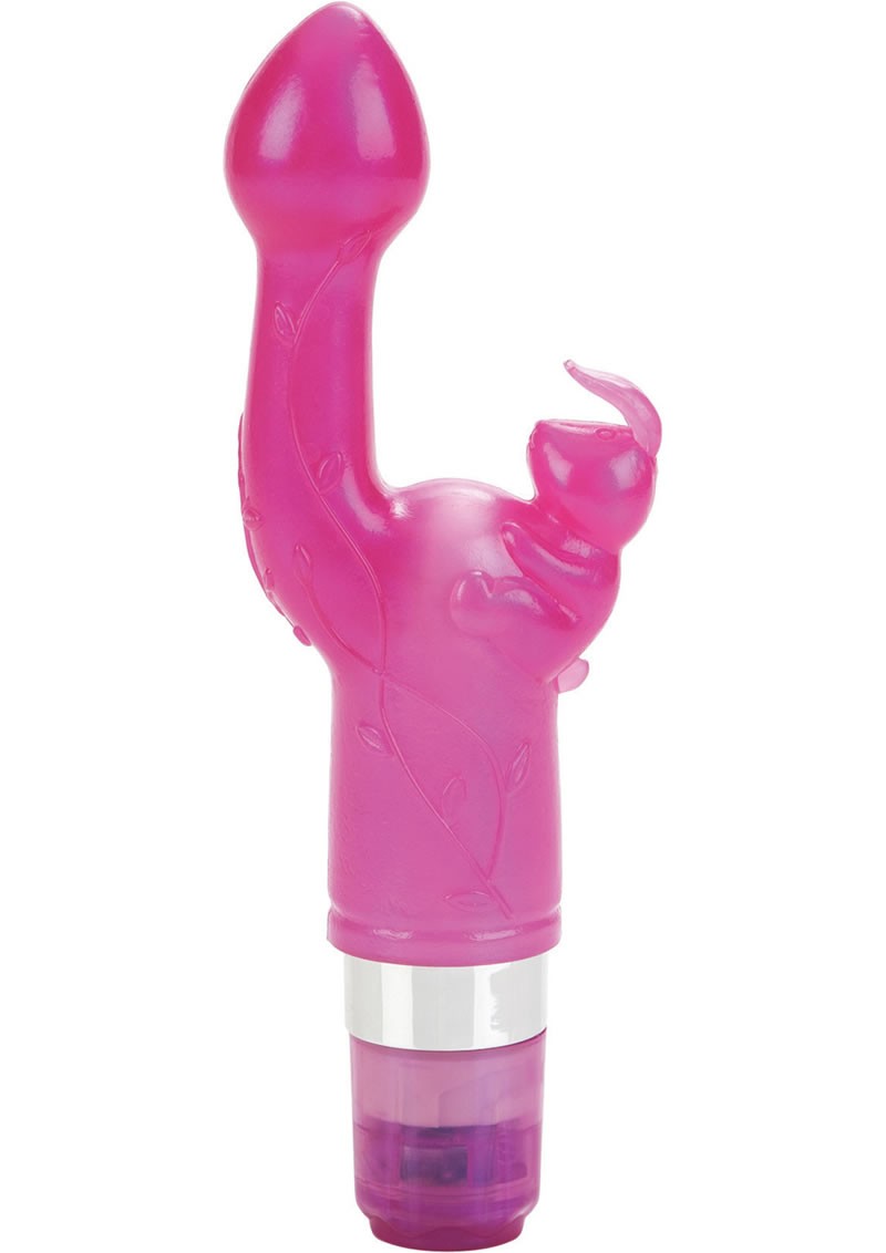 Ultimate bouncing bunny with flickering ears. Ergonomic design for G-spot stimulation. 9 intense functions of vibration, pulsation, and escalation. Easy push button control. Sized for beginners and advanced users. TPR (massager) ABS with Silver Plating (dcor) ABS (cap). 2 AAA batteries. 2.75 x 1.25/ 7 cm x 3.25 cm