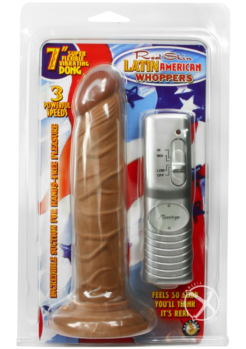Real skin 7" vibrating dong. 3 powerful speeds. Suction cup base. Material: Dong-PVC, Remote-ABS. Waterproof and Phthalates free. RoHS compliant. 3 AA batteries.
