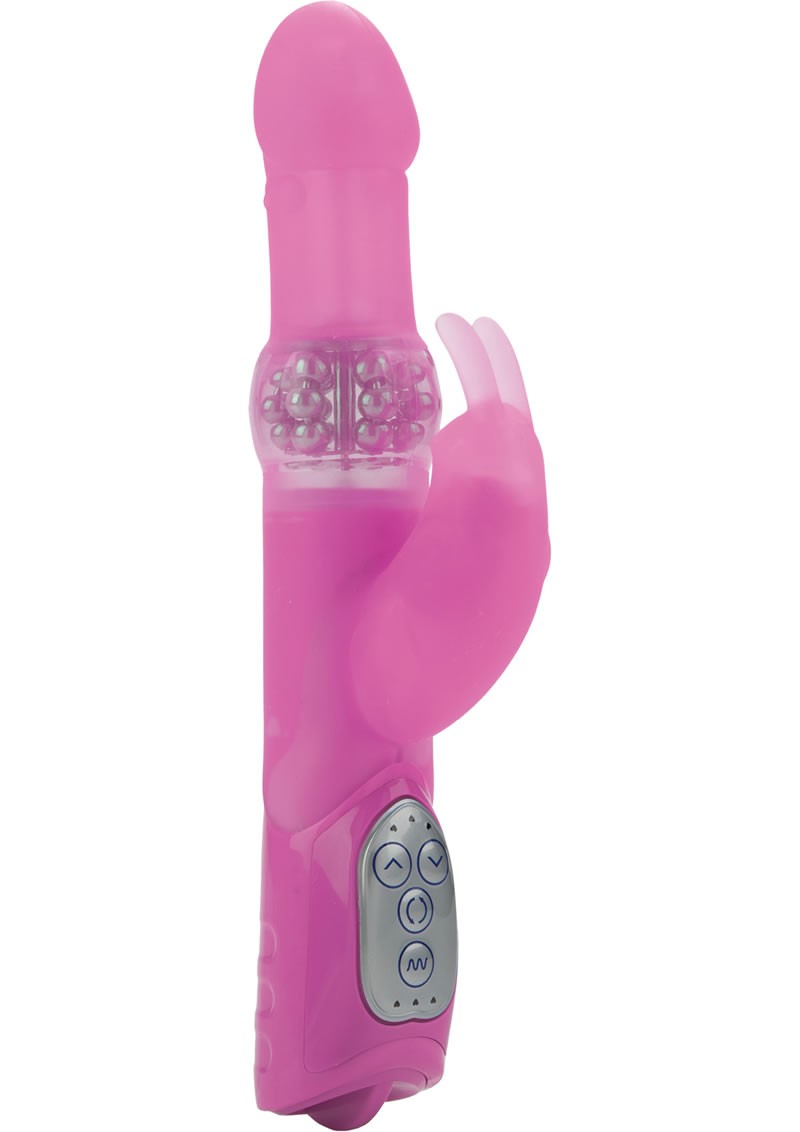 Our all time best selling Jack Rabbit is now made with superior Silicone! Intensely stimulating pleasure dome with 6 columns of reversible, non-jamming, rotating beads. 3 incredible speeds of shaft rotation. Vibrating rabbit with 7 powerful functions of vibration, pulsation, and escalation. EZ load battery pack. Streamlined, power-packed controller with soft touch buttons and heart shaped LED lights. Silicone (vibrator) ABS (controller) Stainless Steel (beads). 3 AA batteries. 5"x 1.75"/ 12.75 cm x 4.5 cm (insertable). 2.25"x 1.5"/ 6.25 cm x 3.75 cm (rabbit).