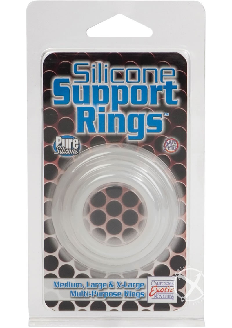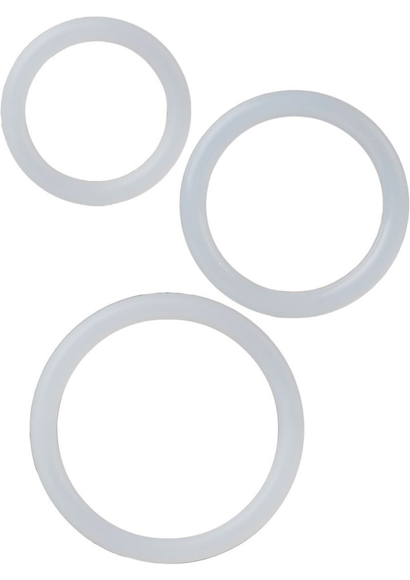 Medium, Large, and X-Large multi-purpose rings. 100% Pure Silicone. 1.25"/ 3 cm (med diameter). 1.5"/ 4 cm (lrg diameter). 2"/ 5 cm (xl diameter).