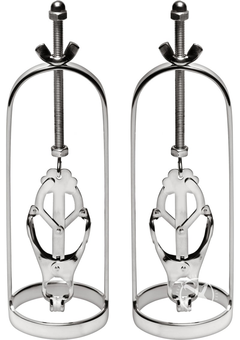 This nipple protraction device is designed to clamp down on and then gradually stretch out the nipple. Comprised of a stainless steel frame supporting a dangling clover clamp, it is designed to grip tighter the further the nipple is stretched. Just affix the clamp just behind the nipple, and twist on the wing nut. As the clamp is pulled upwards, the grip is increased, stretching the nipple out. This unique piece can be used by both men and women, and is sure to guarantee the most intense nipple sensation.