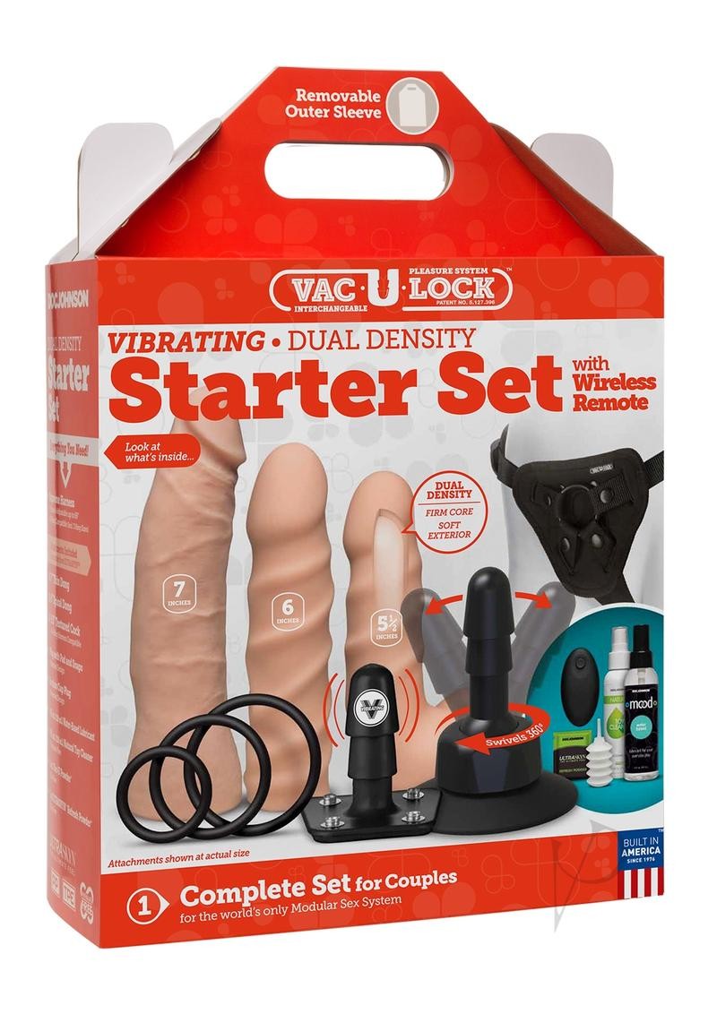 Your perfect strap-on experience is on lock with Doc Johnson’s deluxe line of full-service Vac-U-Lock Deluxe Sets. The Vac-U-Lock Dual Density ULTRASKYN Set is a solid investment for upgrading or beginning your strap-on accessories collection, offering multiple options in one box via a complete harness with removable O-rings, a 7-function rechargeable vibrating Vac-U Plug with remote, three ULTRASKYN attachments, and a bottle of Mood water-based lube. These lifelike dual density attachments — a 7" Thin Dong, a 6" Spiral Dong, and a 5.5" Textured Cock — warm to body temperature with use and feature a soft exterior that gives way to a firm inner core, recreating the feel of a real erect penis. Attachments can be used with the harness, the included 360° Swivel Suction Cup, and any other accessory or harness in the line. The Vac-U-Lock Dual Density Starter Set also includes Doc Johnson Natural Toy Cleaner and ULTRASKYN Refresh Powder to properly and hygienically maintain your dual density ULTRASKYN attachments. Every product in the patented Vac-U-Lock system is designed to help you create any strap-on or toy you’re in the mood for, and it’s as simple as popping on the attachment of your choice.