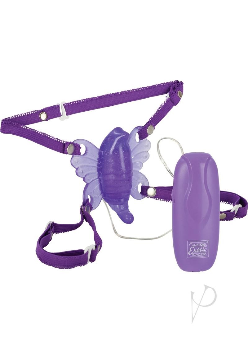 Learn how enjoy erotic pleasure, hands free with this soft purple jelly Butterfly. A multi-speed battery pack controls the vibrations and flutters of pure ecstasy. An adjustable pink elastic lace waist strap connects the top of each wing; matching leg straps attach to the bottom of either wing. One size fits most.
